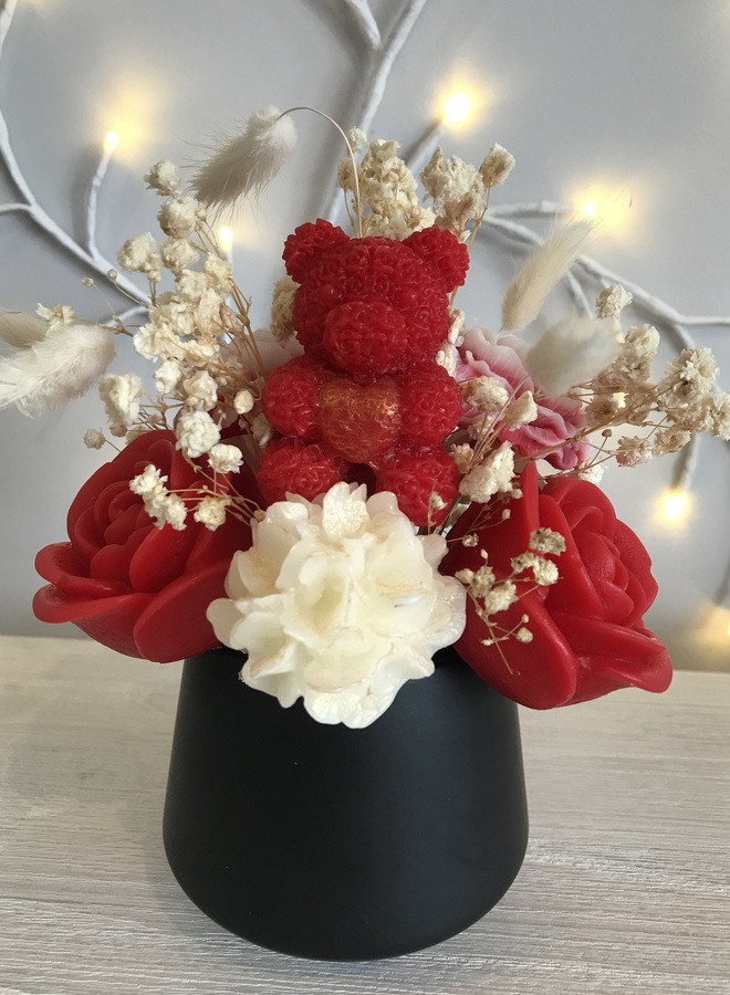 Black ceramic pot which contains red & white flowers & a teddy, some with gold mica powder. Amongst the flowers are some dried gypsophila & 5 white bunny tails.