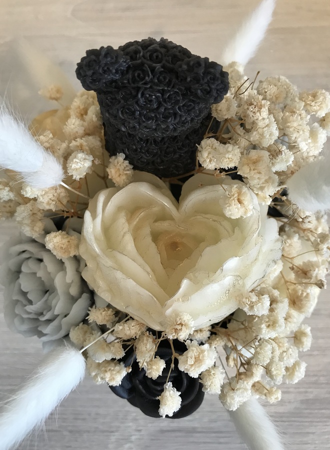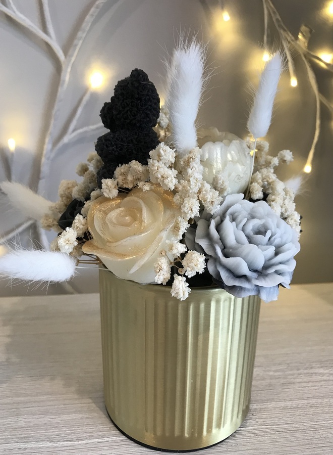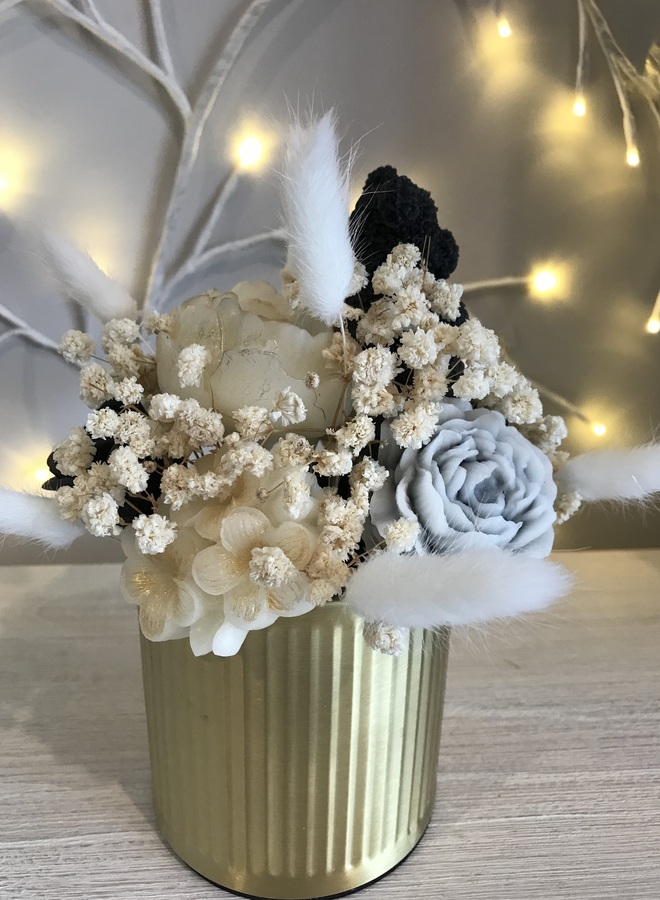 Gold metal canister which contains black & white flowers with a teddy, some with gold mica powder. Amongst the flowers are some dried gypsophila & 7 white bunny tails.
