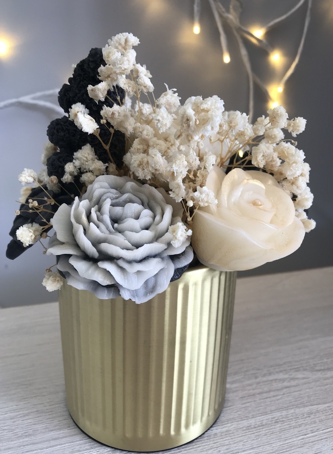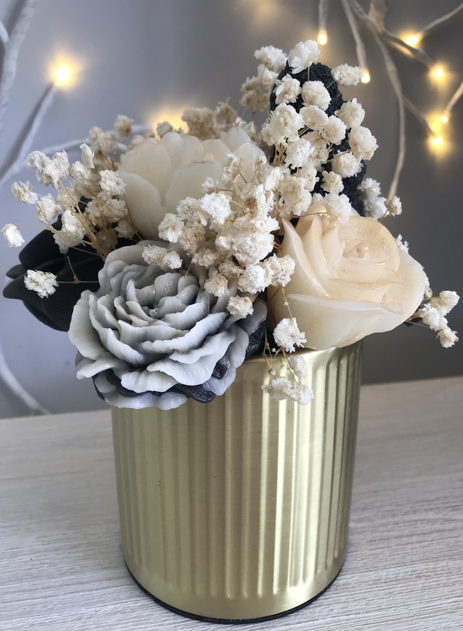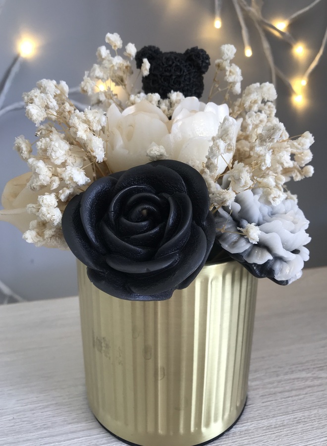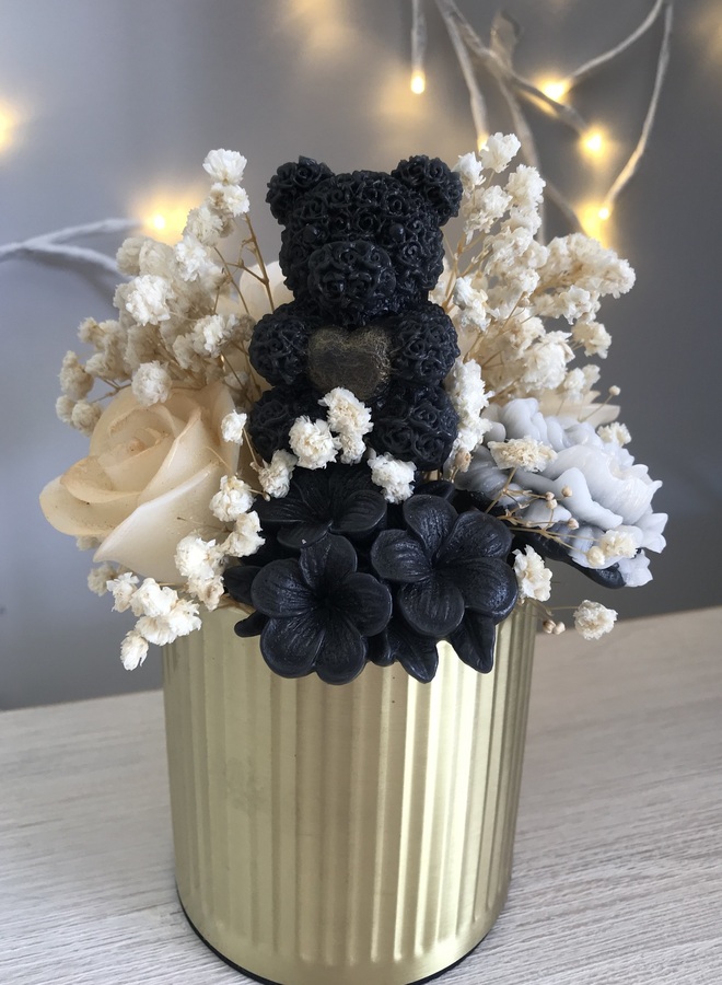 Gold metal canister which contains black & white flowers with a teddy, some with gold mica powder. Amongst the flowers are some dried gypsophila.