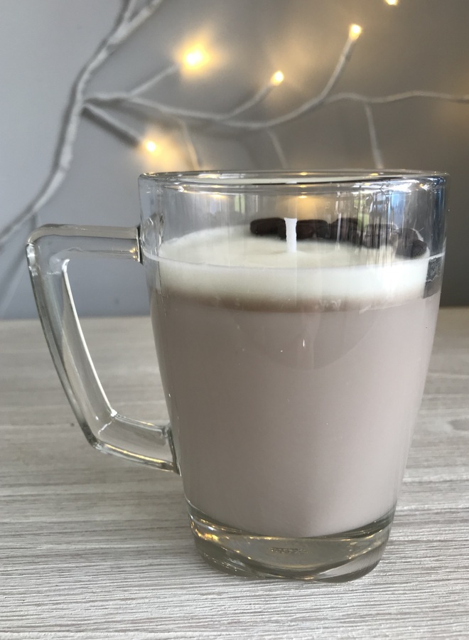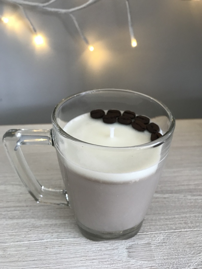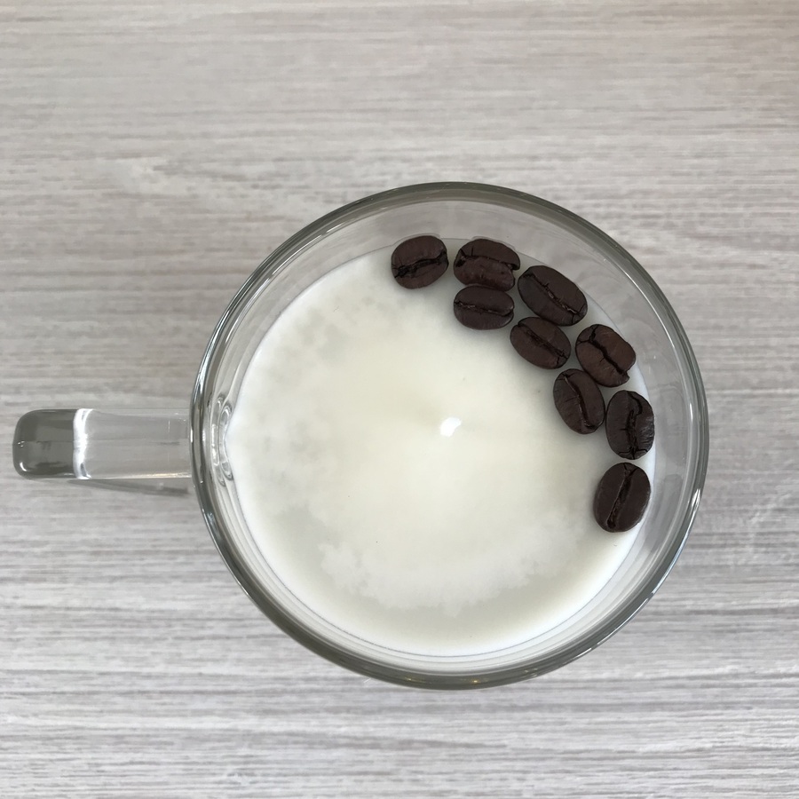 Gorgeous pre-loved glass coffee mug with handle scented soy wax candle with coffee beans.