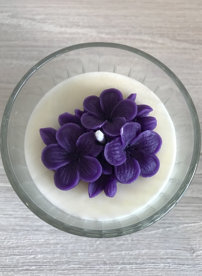 Gorgeous pre-loved patterned whiskey glass scented soy wax candle with a purple plumeria.