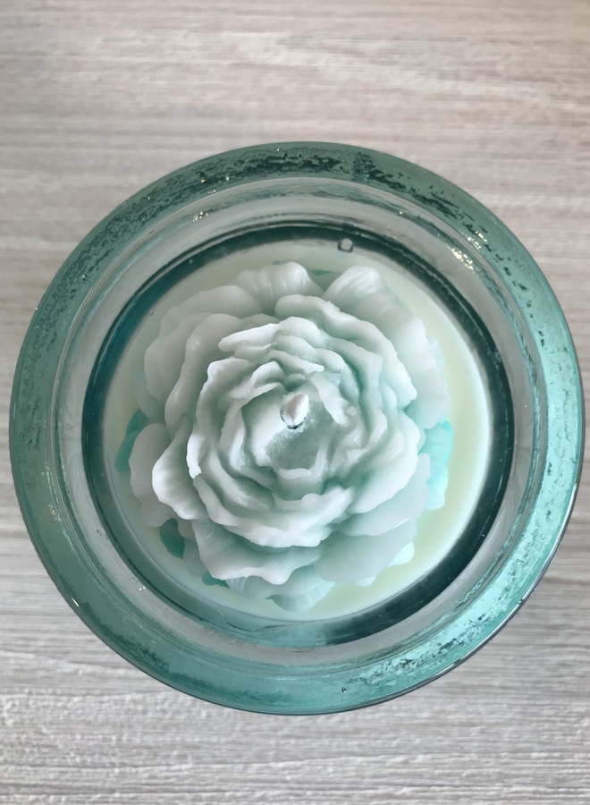 Gorgeous pre-loved recycled green glass scented soy wax candle with a turquoise peony rose.