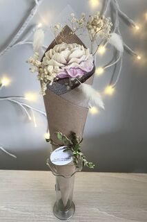 Soy wax melt wrapped bouquet which contains a purple & white peony rose. Amongst the rose is some dried gypsophila & 3 white bunnytails.