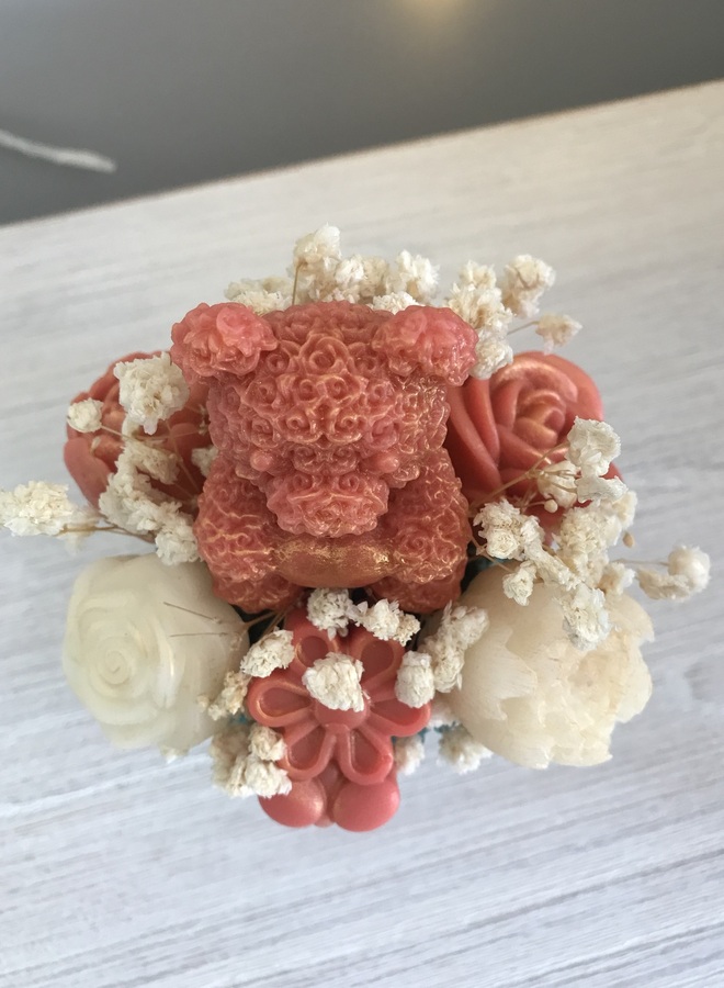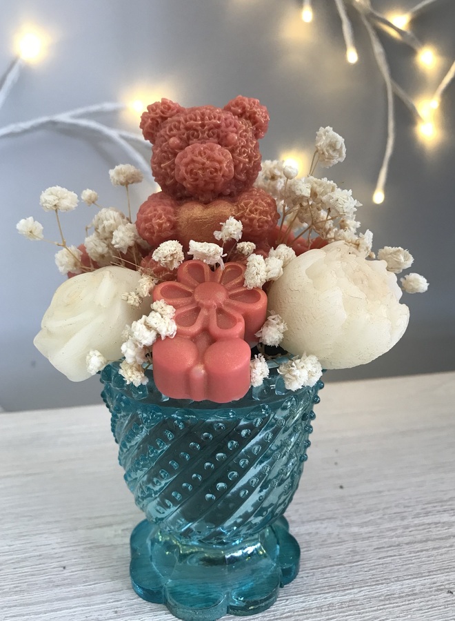 Turquoise glass votive which contains burnt orange & white flowers with a teddy, some with gold mica powder. Amongst the flowers are some dried gypsophila.