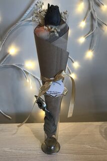 Wax melt wrapped bouquet which contains orange & black flowers, some with gold mica powder. Amongst the flowers are some dried gypsophila & 3 bunny tails.