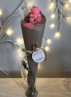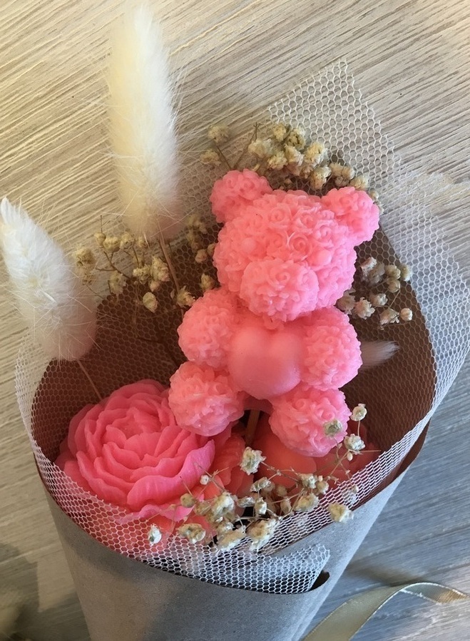 Wax melt wrapped bouquet which contains pink & white flowers & a teddy bear, some with gold mica powder. Amongst the flowers are some dried gypsophila & 3 bunny tails.