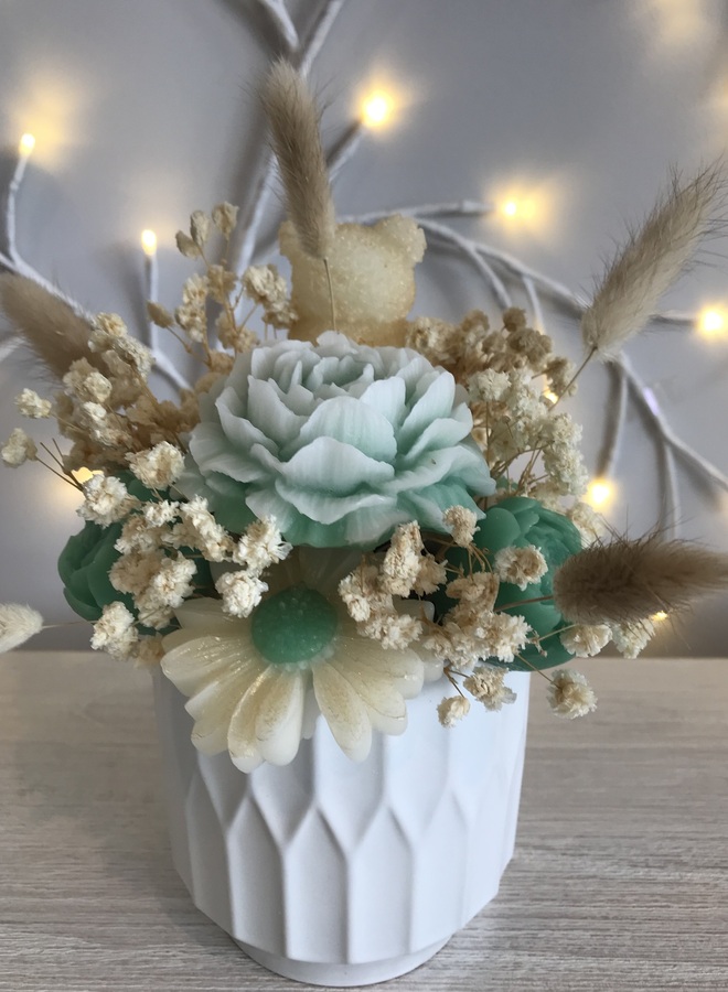 White patterned ceramic pot which contains green & white flowers & a teddy, some with gold mica powder. Amongst the flowers are some dried gypsophila & 5 natural bunny tails.