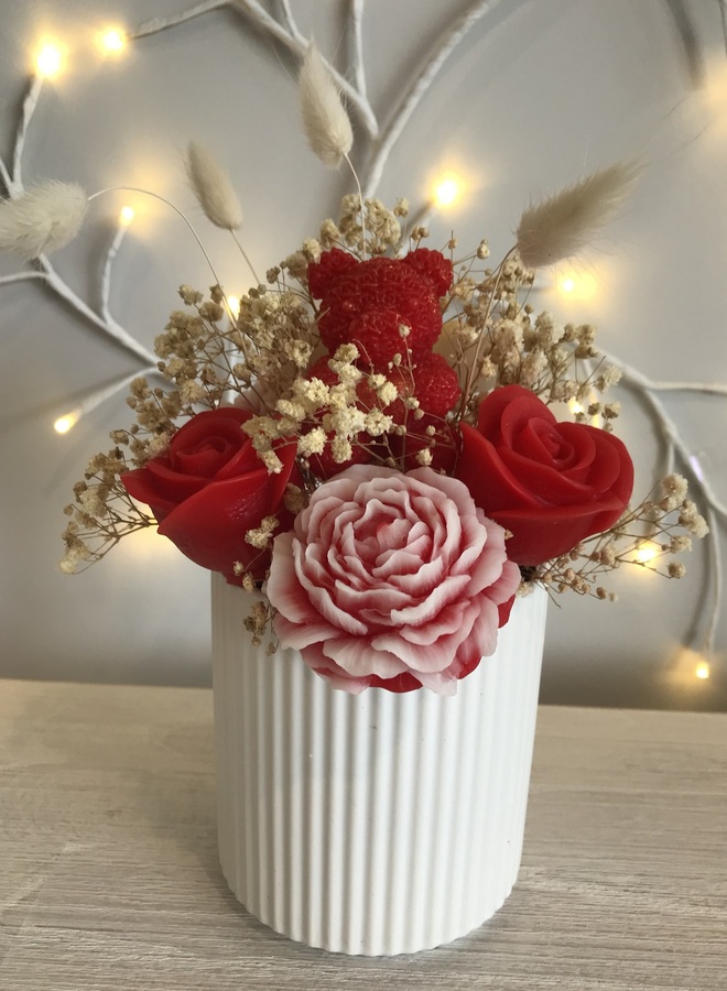 White vertically lined ceramic pot which contains red & white flowers, butterfly & teddy, some with gold mica powder. Amongst the flowers are some dried gypsophila & 5 white bunny tails.